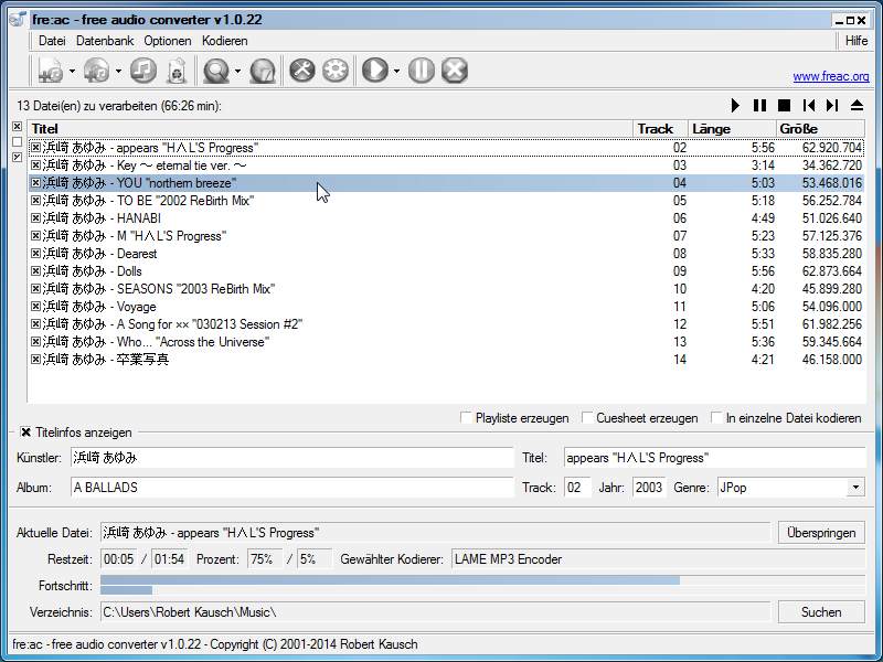 fre:ac ist ein freier Audiokonverter und CD-Ripper mit Unterstützung für viele populäre Formate und Kodierer. Es unterstützt derzeit die Formate MP3, MP4/M4A, WMA, Ogg Vorbis, FLAC, AAC, WAV und Bonk.