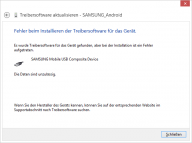 Weiter wird mein Galaxy S3 nicht erkannt. Ich habe den Treiber, den ich über das Windows Update bekommen kann probiert zu installieren, aber auch hier: Fehler bei der Installation. Im Netz gibt es den Treiber aus der Kies-Software (Samsung_USB-Driver_for_Mobile_Phones-1.5.16.0.exe) auch hier Fehler bei der Installation (siehe Bilder- auch die Installation als Administrator auszuführen ändert nichts).