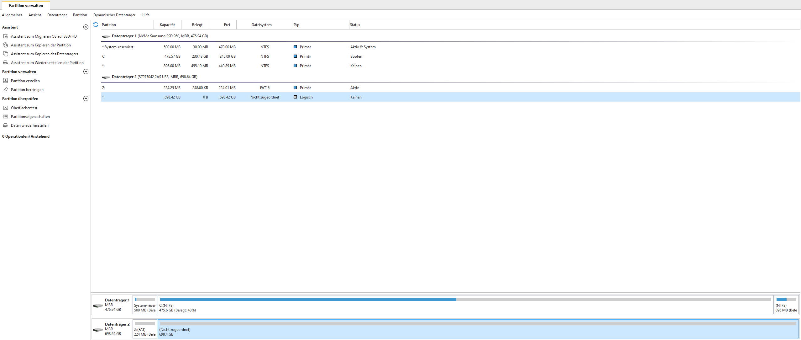 Unter Verwalten allerdings steht die komplette Festplatte mit ca: 698GB angezeigt aber als FAT16...